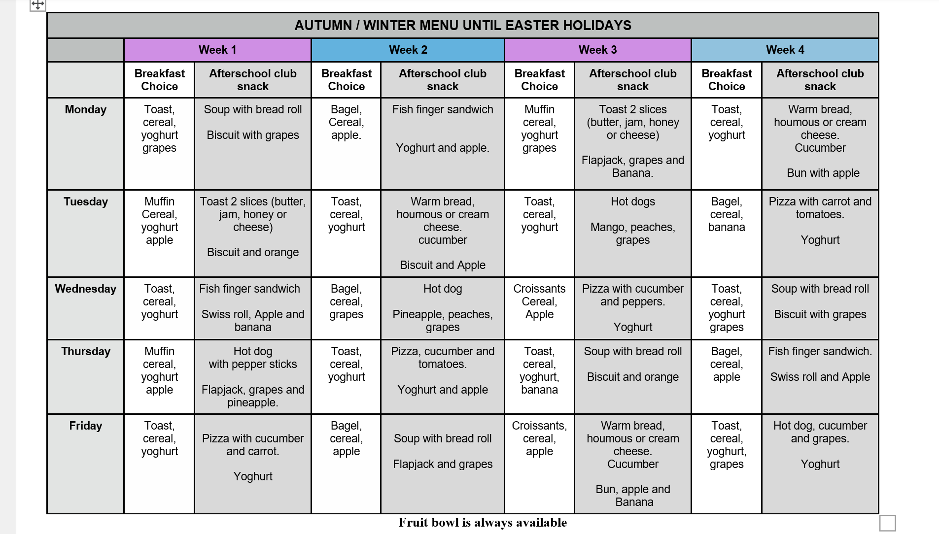 We have an Autumn/Winter menu and a Spring/Summer menu. See below.